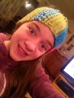 Hurra for minstejenta som fyller 12år i dag. Tiden går jammen fort .Her viser hun stolt fram pannebåndet ho strikka på en kveld .Nå er ho i full gang med og strikke et pannebånd til pappa